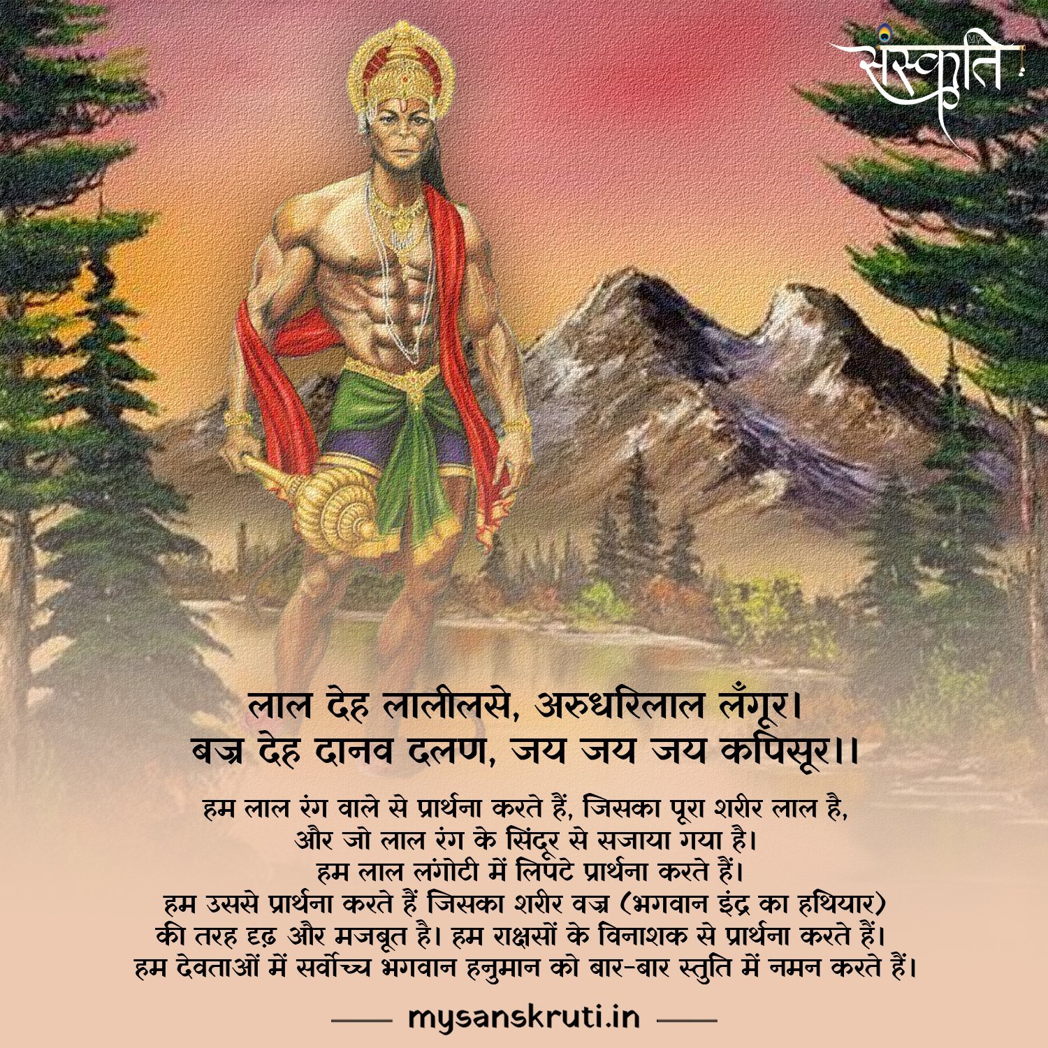 We pray to the one with red complexion, whose whole body is red, and who is decorated with vermilion of red colour. We pray wrapped in red loincloth. We pray to him whose body is strong like Vajra (the weapon of Lord Indra) and is strong. We pray to the destroyer of demons. We bow again and again in praise to Lord Hanuman, the supreme of the gods.